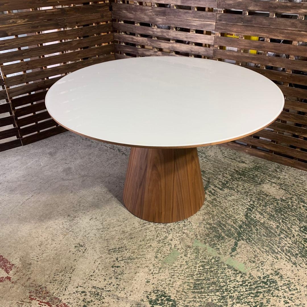 ご覧頂きありがとうございます。放射状に広がる木目模様「サンバースト」デザインが特徴的な、直径120cmの円形ダイニングテーブルです。北欧モダンやミッドセンチュリーな雰囲気のお部屋に非常に映える一台です。■デザイン・材質について サンバースト天板:中央から光が放たれるような美しいデザインです。 木目調プリント仕様:天板はウォールナット柄のプリント化粧板です。本物の木と違い、飲み物をこぼしてもシミになりにくく、日常のお手入れが非常に楽なのがメリットです。 天然木の脚部:脚には天然木(ラバーウッド)を使用しており、 北欧由来のテーパードレッグを採用。線が細く、圧迫感を感じさせない端正なフォルムです。 ■サイズ・仕様 サイズ:幅120 × 奥行120 × 高さ70cm(4人でゆったりと囲めるサイズです) 天板:木目調プリント化粧板 脚部:天然木(ラバーウッド) 重量:約20kg■状態と配送 3年半ほど使用しました。過去に猫を飼育しておりましたので天板に若干の引っかき傷や輪じみがございますが、まだまだ現役でお使いいただけます。 すでに解体済みですので、搬入もスムーズです。組み立て用のボルト類も同梱いたします。 送料込みの価格です。